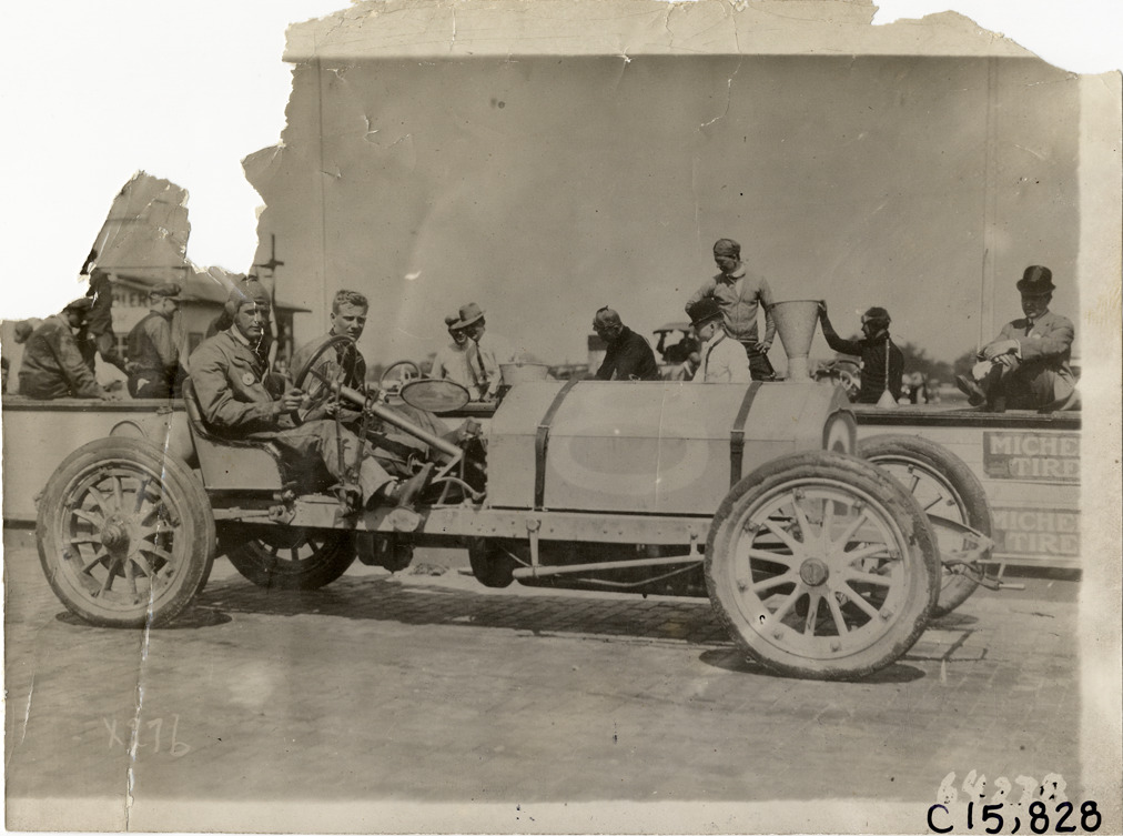 Driver and passenger in racecar, 1910 Vanderbilt Cup races