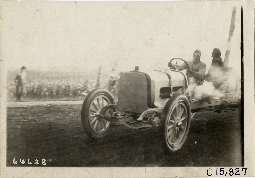 View of driver and passenger racing Corbin car past spectators during the 1910 Vanderbilt Cup races on Long Island, New York. Stamped on back: "Spooner & Wells, Inc., photographers, telephones 3472-3473 Columbus, 1931 Broadway, New York." Handwritten on back: "Races and racing--Vanderbilt Cup races, 1910."