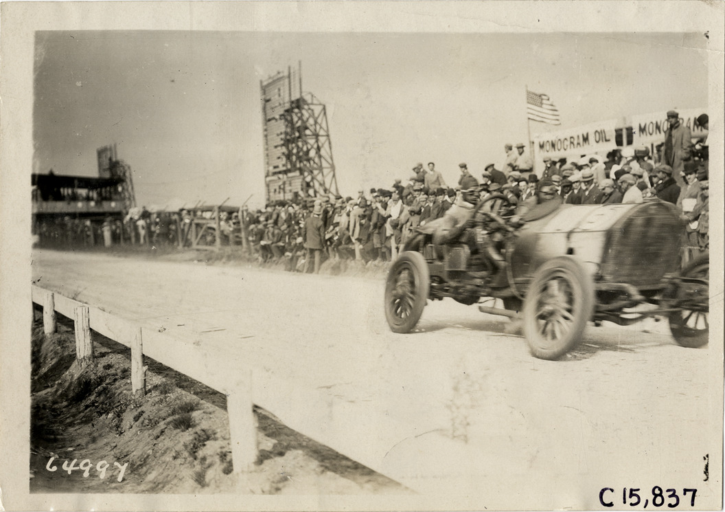 View of driver and passenger racing Stoddard-Dayton car no. 15 past spectators during the 1910 Vanderbilt Cup races on Long Island, New York. Stamped on back: "Spooner & Wells, Inc., photographers, telephones 3472-3473 Columbus, 1931 Broadway, New York." Handwritten on back: "Races and racing--Vanderbilt Cup races, 1910."