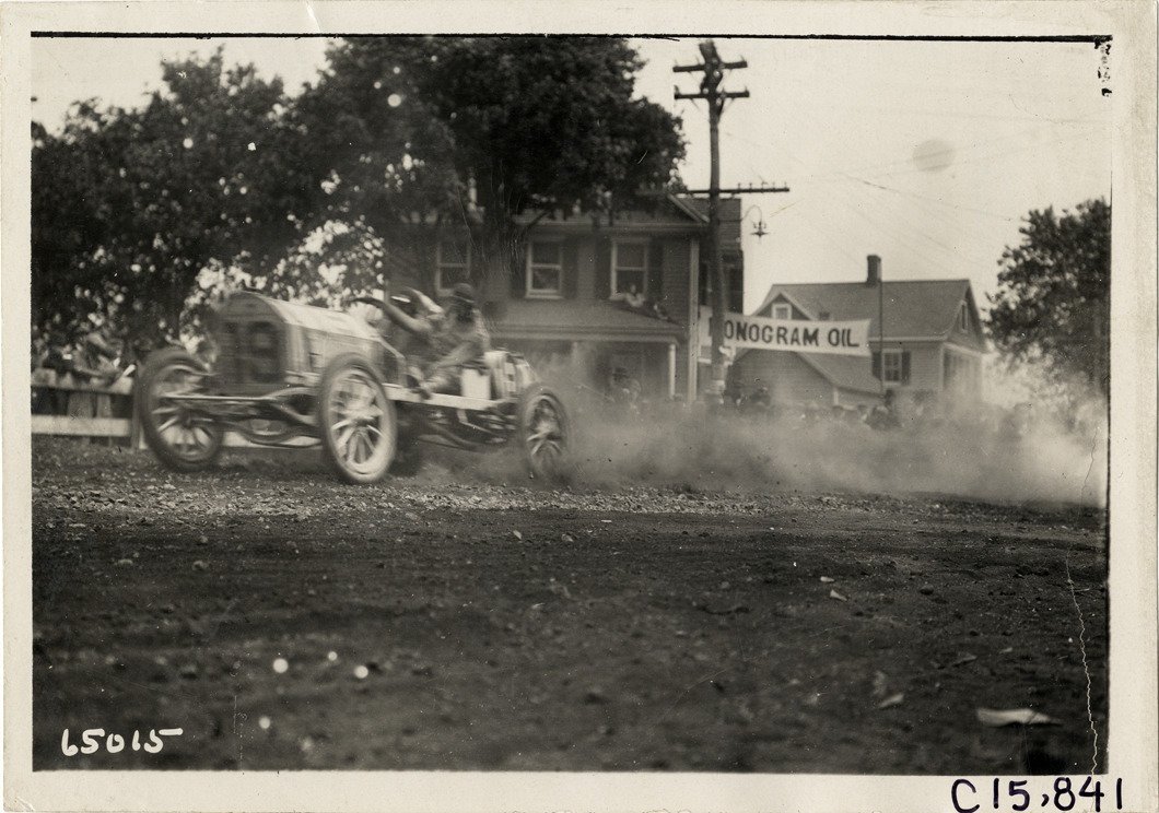 View of driver and passenger racing car no. 19 past spectators during the 1910 Vanderbilt Cup races on Long Island, New York. Wooden-frame houses and Monogram oil banner in background. Stamped on back: "Spooner & Wells, Inc., photographers, telephones 3472-3473 Columbus, 1931 Broadway, New York." Handwritten on back: "Races and racing--Vanderbilt Cup races, 1910."