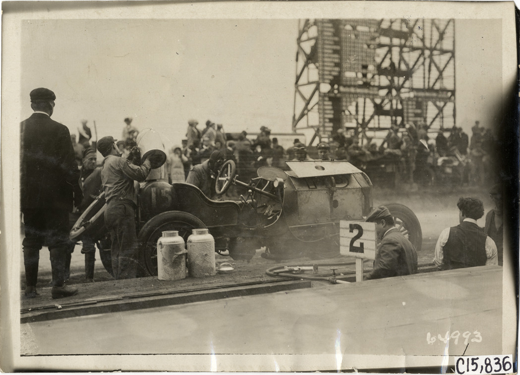View of pit crew working on car no. 15 during the 1910 Vanderbilt Cup races on Long Island, New York. Water cans on pit ledge; "2" sign displayed in foreground. Stamped on back: "Spooner & Wells, Inc., photographers, telephones 3472-3473 Columbus, 1931 Broadway, New York." Handwritten on back: "Races and racing--Vanderbilt Cup races, 1910."