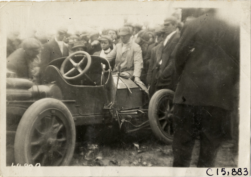 Crowd surrounding damaged racecar, 1910 Vanderbilt Cup races