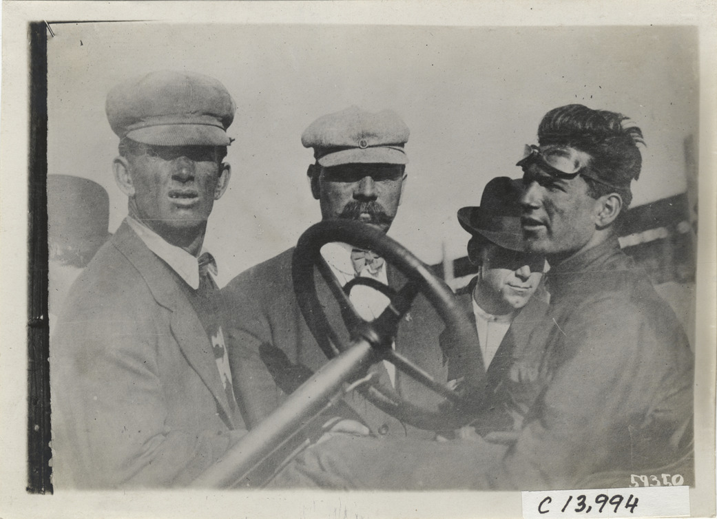 Close-up view of driver in racecar during the 1910 Los Angeles races at the Los Angeles Motordrome in California. Three men stand next to car. Stamped on back: "Spooner & Wells, Inc., photographers, telephones 3472-3473 Columbus, 1931 Broadway, New York." Handwritten on back: "Races and racing--Los Angeles races, 1910."