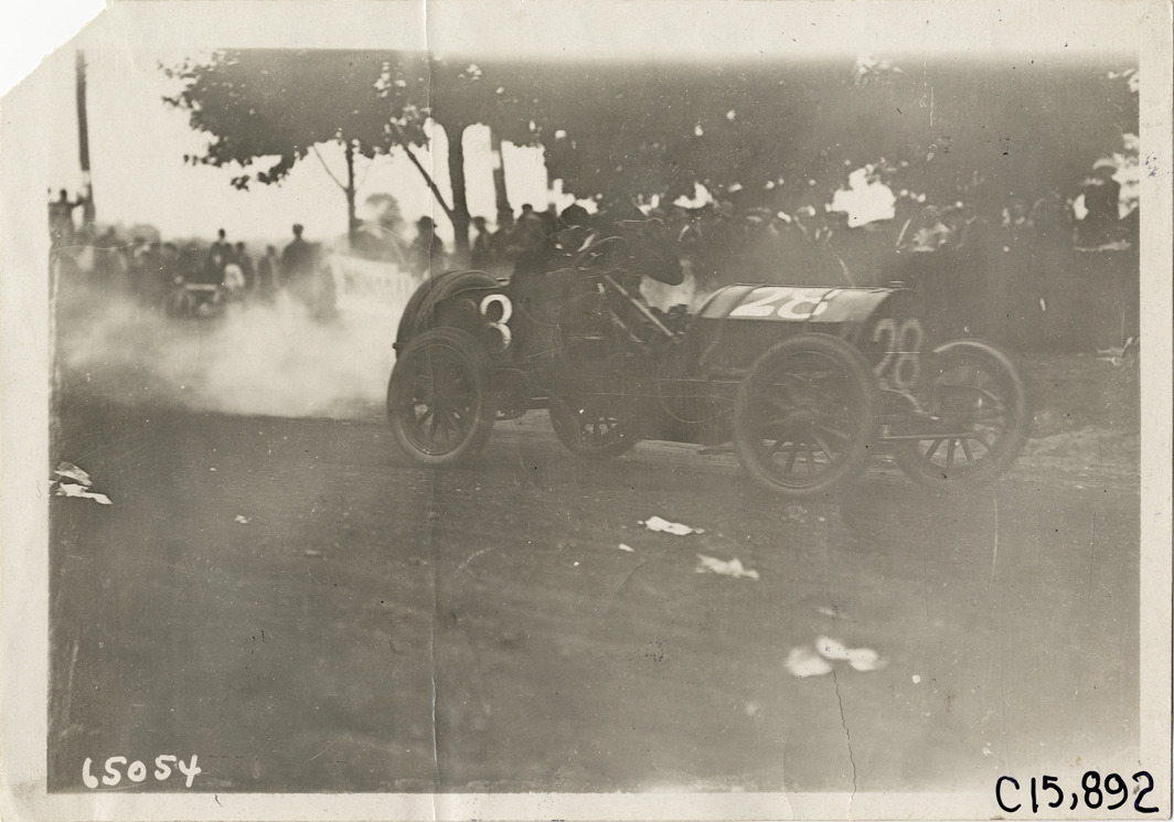 View of driver and passenger racing car no. 28 past spectators during the 1910 Vanderbilt Cup races on Long Island, New York. Car leaves a trail of smoke. Stamped on back: "Spooner & Wells, Inc., photographers, telephones 3472-3473 Columbus, 1931 Broadway, New York." Handwritten on back: "Races and racing--Vanderbilt Cup races, 1910."