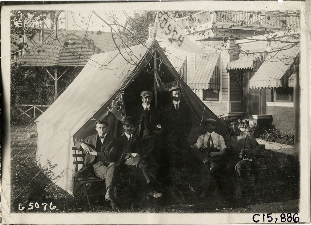 Men posing in front of Bosch tent, 1910 Vanderbilt Cup races