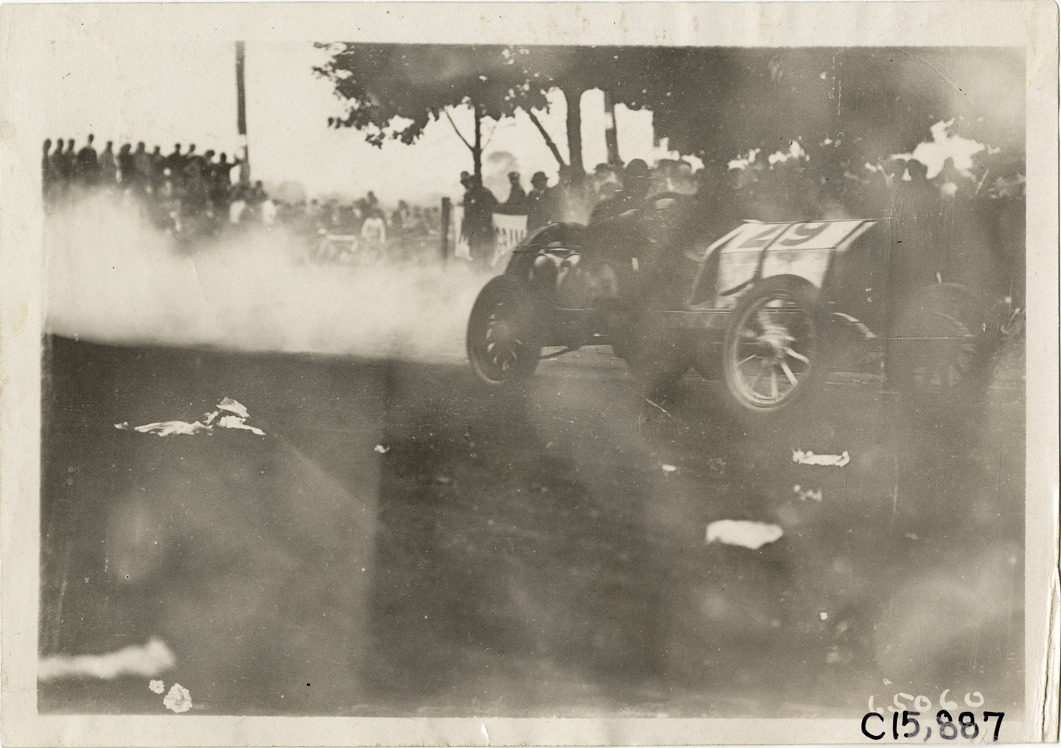 View of driver and passenger racing car no. 29 past spectators during the 1910 Vanderbilt Cup races on Long Island, New York. Car leaves a trail of smoke. Stamped on back: "Spooner & Wells, Inc., photographers, telephones 3472-3473 Columbus, 1931 Broadway, New York." Handwritten on back: "Races and racing--Vanderbilt Cup races, 1910."