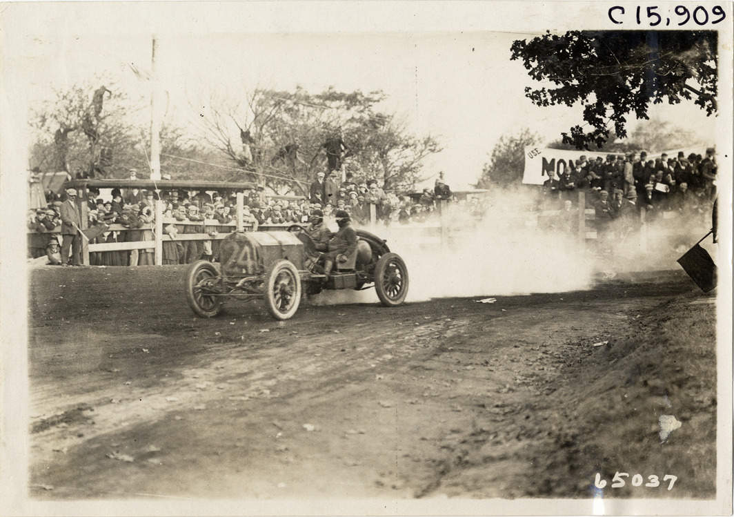 View of driver and passenger racing car no. 24 past spectators during the 1910 Vanderbilt Cup races on Long Island, New York. Car leaves a trail of smoke. Stamped on back: "Spooner & Wells, Inc., photographers, telephones 3472-3473 Columbus, 1931 Broadway, New York." Handwritten on back: "Races and racing--Vanderbilt Cup races, 1910."