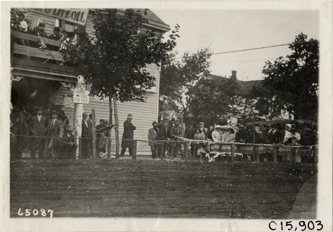 View of spectators on roadside, standing behind low wooden fence, during the 1910 Vanderbilt Cup races on Long Island, New York. Wooden-frame building and "Parking space for sale" sign in background. Stamped on back: "Spooner & Wells, Inc., photographers, telephones 3472-3473 Columbus, 1931 Broadway, New York." Handwritten on back: "Races and racing--Vanderbilt Cup races, 1910."