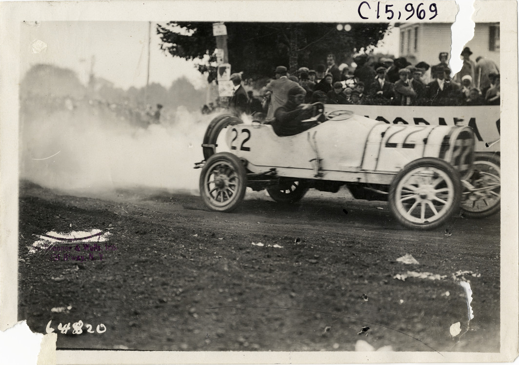View of driver and passenger racing car no. 22 past spectators during the 1910 Vanderbilt Cup races on Long Island, New York. Car leaves a trail of smoke. Stamped on back: "Spooner & Wells, Inc., photographers, telephones 3472-3473 Columbus, 1931 Broadway, New York." Handwritten on back: "Races and racing--Vanderbilt Cup races, 1910."