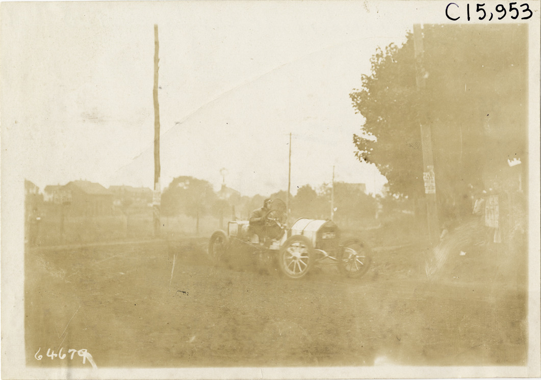 View of driver and passenger racing car around turn during the 1910 Vanderbilt Cup races on Long Island, New York. Stamped on back: "Spooner & Wells, Inc., photographers, telephones 3472-3473 Columbus, 1931 Broadway, New York." Handwritten on back: "Races and racing--Vanderbilt Cup races, 1910."