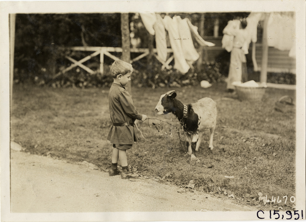 View of young boy playing with goat during the 1910 Vanderbilt Cup races on Long Island, New York. Woman hangs laundry on clothesline in background. Stamped on back: "Spooner & Wells, Inc., photographers, telephones 3472-3473 Columbus, 1931 Broadway, New York." Handwritten on back: "Races and racing--Vanderbilt Cup races, 1910."