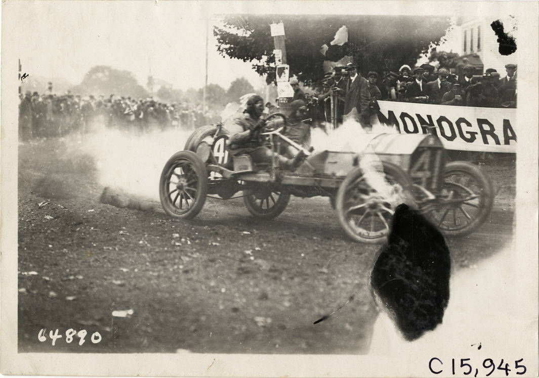 View of driver and passenger racing car no. 41 past spectators during the 1910 Vanderbilt Cup races on Long Island, New York. Stamped on back: "Spooner & Wells, Inc., photographers, telephones 3472-3473 Columbus, 1931 Broadway, New York." Handwritten on back: "Races and racing--Vanderbilt Cup races, 1910."