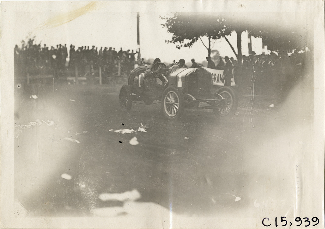 View of driver and passenger racing car no. 1 past spectators during the 1910 Vanderbilt Cup races on Long Island, New York. Stamped on back: "Spooner & Wells, Inc., photographers, telephones 3472-3473 Columbus, 1931 Broadway, New York." Handwritten on back: "Races and racing--Vanderbilt Cup races, 1910."