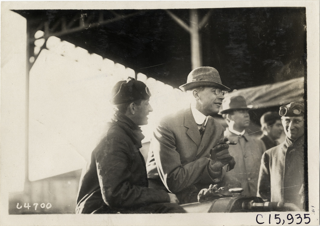 Racecar drivers and man smoking cigar, 1910 Vanderbilt Cup races