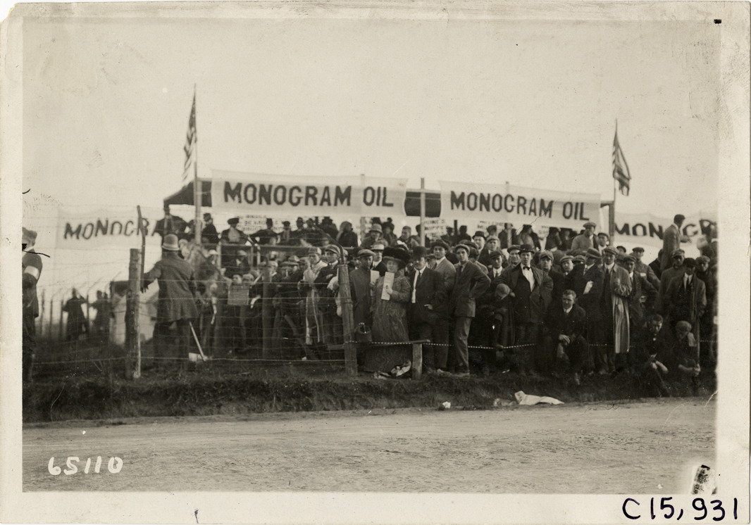 View of spectators on roadside during the 1910 Vanderbilt Cup races on Long Island, New York. Monogram oil banners in background. Stamped on back: "Spooner & Wells, Inc., photographers, telephones 3472-3473 Columbus, 1931 Broadway, New York." Handwritten on back: "Races and racing--Vanderbilt Cup races, 1910."