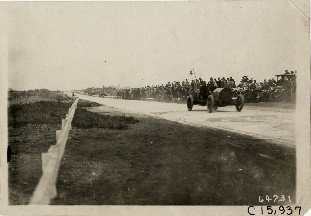 View of driver and passenger racing car no. 25 past spectators during the 1910 Vanderbilt Cup races on Long Island, New York. Stamped on back: "Spooner & Wells, Inc., photographers, telephones 3472-3473 Columbus, 1931 Broadway, New York." Handwritten on back: "Races and racing--Vanderbilt Cup races, 1910."