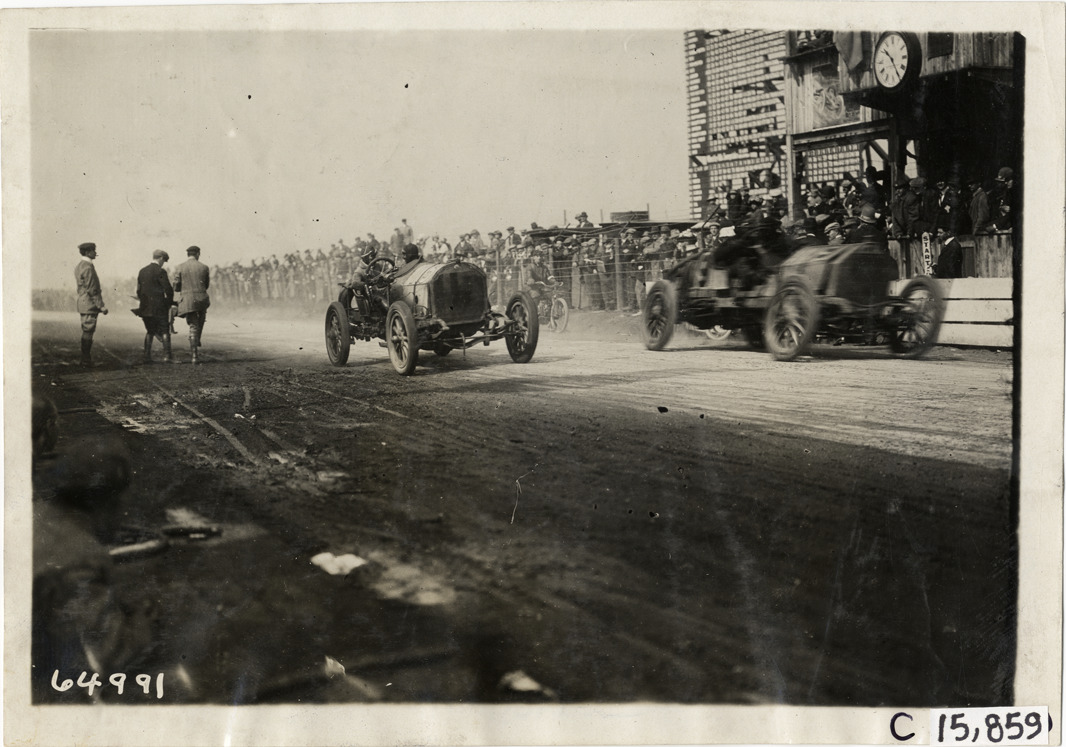 View of car no. 7 and car no. 15 at starting line during the 1910 Vanderbilt Cup races on Long Island, New York. Spectators and scoreboard in background. Stamped on back: "Spooner & Wells, Inc., photographers, telephones 3472-3473 Columbus, 1931 Broadway, New York." Handwritten on back: "Races and racing--Vanderbilt Cup races, 1910."