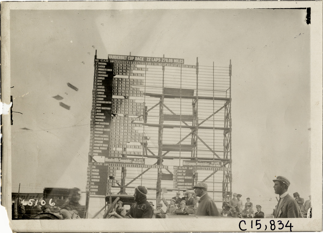 View of scoreboard during the 1910 Vanderbilt Cup races on Long Island, New York. Stamped on back: "Spooner & Wells, Inc., photographers, telephones 3472-3473 Columbus, 1931 Broadway, New York." Handwritten on back: "Races and racing--Vanderbilt Cup races, 1910."