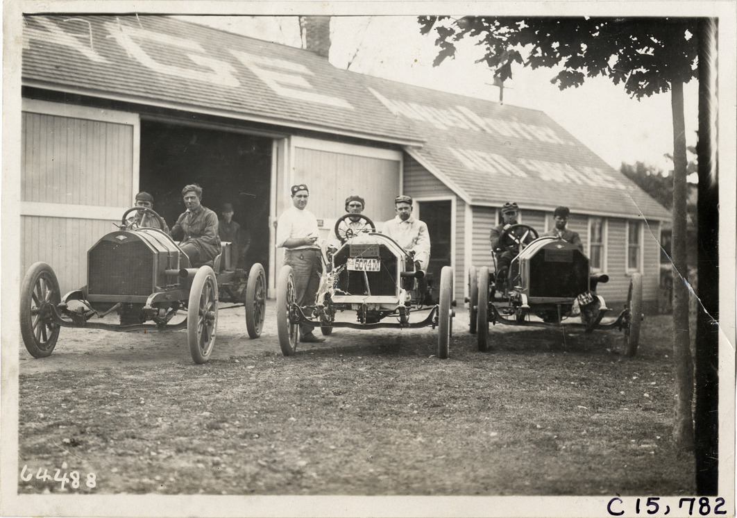 Racecars parked in front of August Porrier's garage, 1910 Vanderbilt Cup races