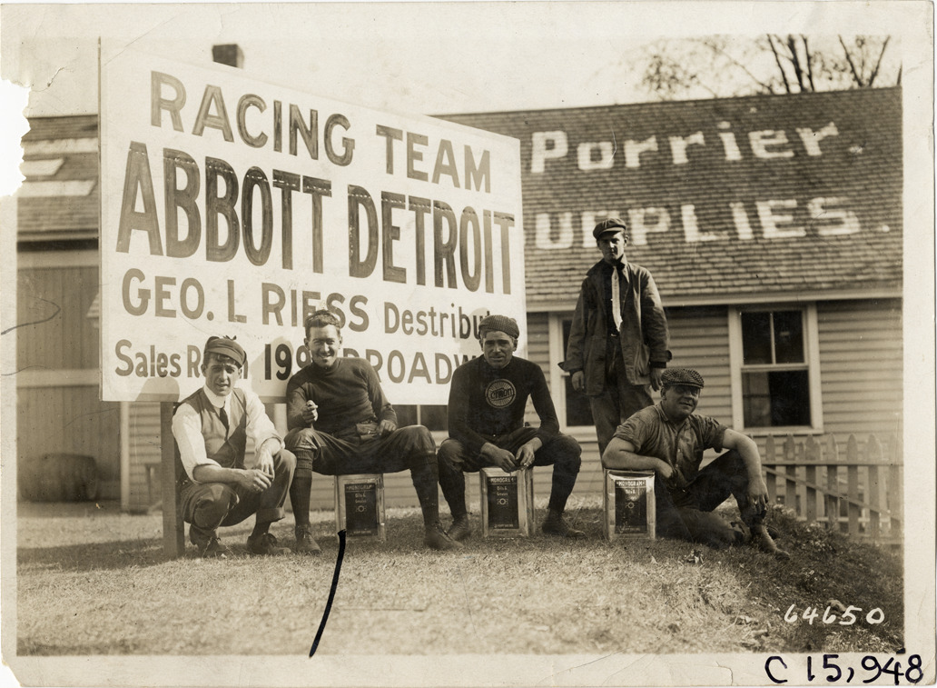 View of five men, some with Monogram oil cans, posing in front of Abbott-Detroit racing team sign during the 1910 Vanderbilt Cup races on Long Island, New York. Sign reads: "Racing team, Abbott Detroit, Geo. L. Riess, destributor [sic], sales room 1993 Broadway." August Porrier's garage in background. Stamped on back: "Spooner & Wells, Inc., photographers, telephones 3472-3473 Columbus, 1931 Broadway, New York." Handwritten on back: "Races and racing--Vanderbilt Cup races, 1910."