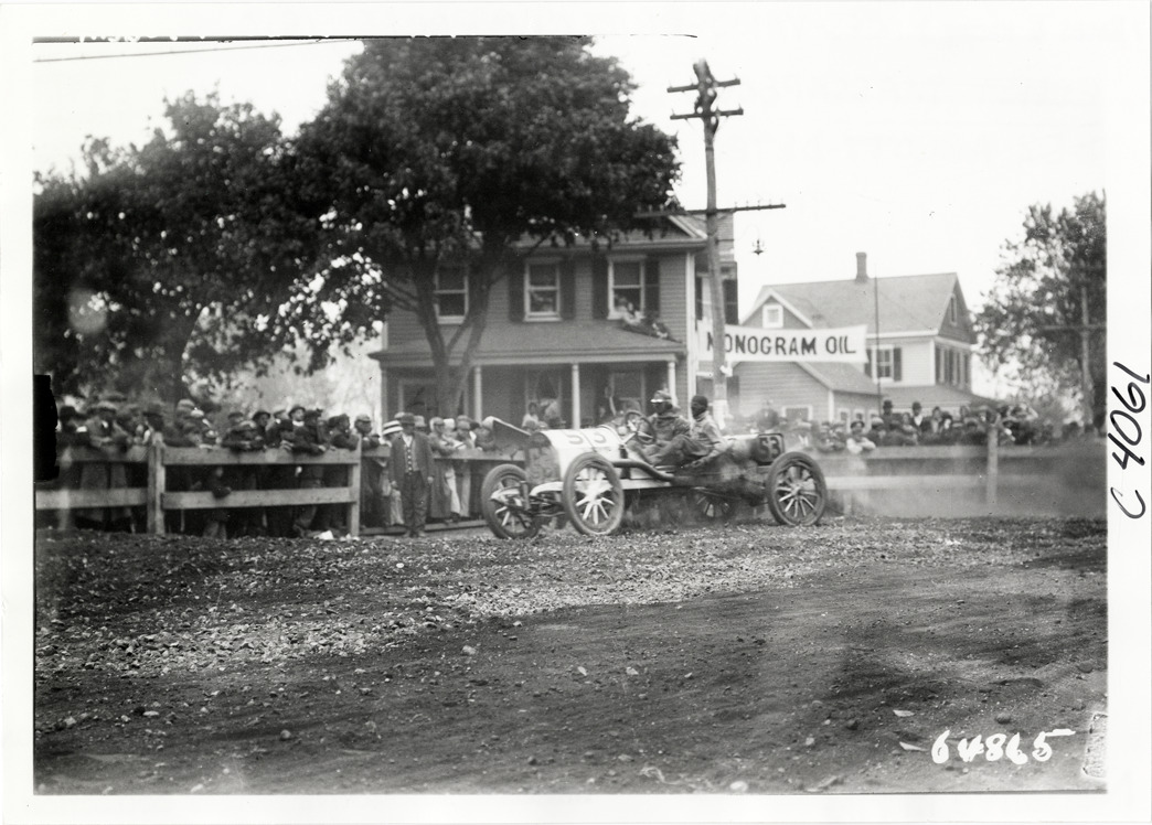 View of Mortimer Roberts and Harry Nichen racing Abbott-Detroit car no. 53 past spectators in Massapequa Sweepstakes during the 1910 Vanderbilt Cup races on Long Island, New York. Houses and Monogram oil banner in background. Handwritten on back: "Event, Massapequa Sweepstakes, 126.4 miles, #53 Abbott-Detroit, driven by Mortimer Roberts, mechanic Harry Nichen. Races and racing--Vanderbilt Cup races, 1910."