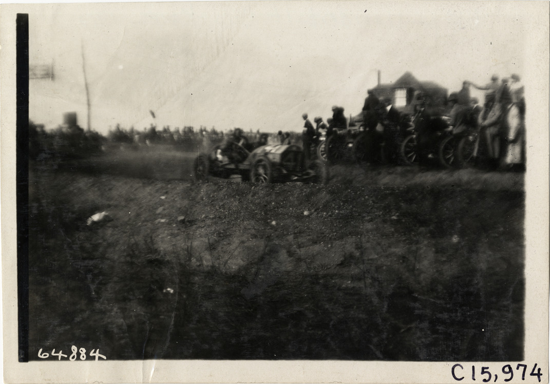 View of driver and passenger racing car no. 41 past spectators during the 1910 Vanderbilt Cup races on Long Island, New York. Stamped on back: "Spooner & Wells, Inc., photographers, telephones 3472-3473 Columbus, 1931 Broadway, New York." Handwritten on back: "Races and racing--Vanderbilt Cup races, 1910."
