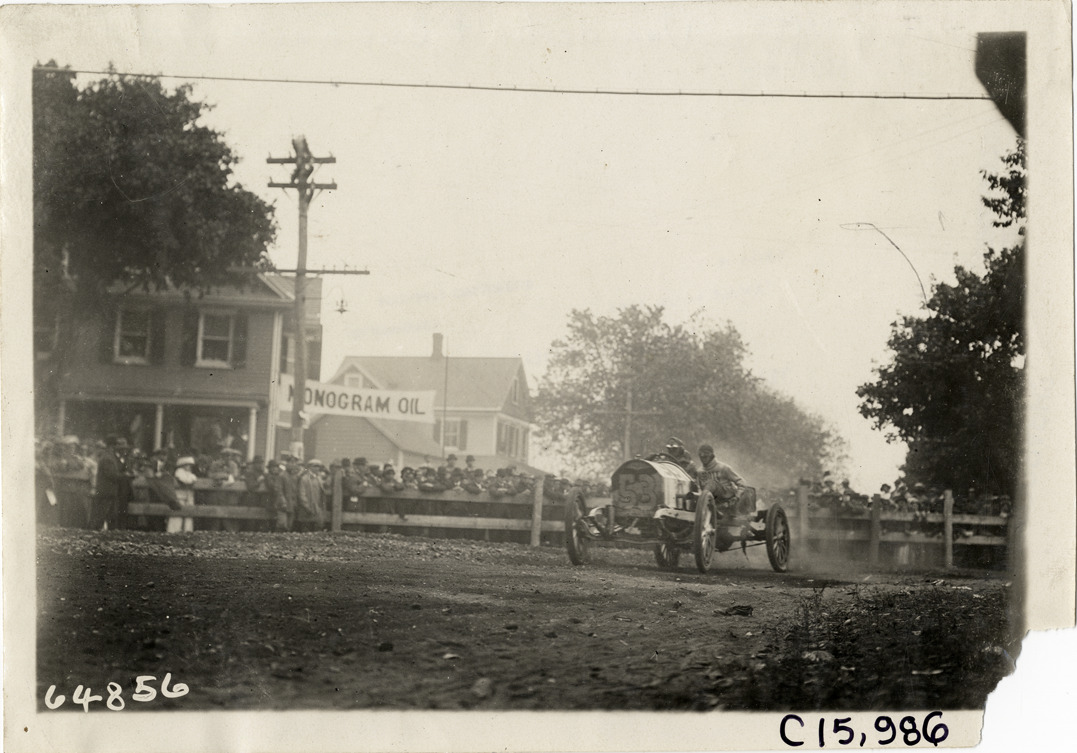 View of driver and passenger racing car no. 53 past spectators during the 1910 Vanderbilt Cup races on Long Island, New York. Houses and Monogram oil banner in background. Stamped on back: "Spooner & Wells, Inc., photographers, telephones 3472-3473 Columbus, 1931 Broadway, New York." Handwritten on back: "Races and racing--Vanderbilt Cup races, 1910."