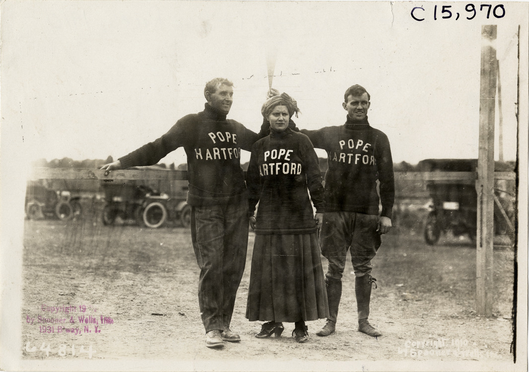 View of two men and a woman, all wearing Pope-Hartford sweaters, during the 1910 Vanderbilt Cup races on Long Island, New York. Stamped on front: "Copyright 1910 by Spooner & Wells, Inc., 1931 B'way, N.Y." Printed on front: "Copyright 1910 by Spooner & Wells, Inc." Stamped on back: "Spooner & Wells, Inc., photographers, telephones 3472-3473 Columbus, 1931 Broadway, New York." Handwritten on back: "Races and racing--Vanderbilt Cup races, 1910."