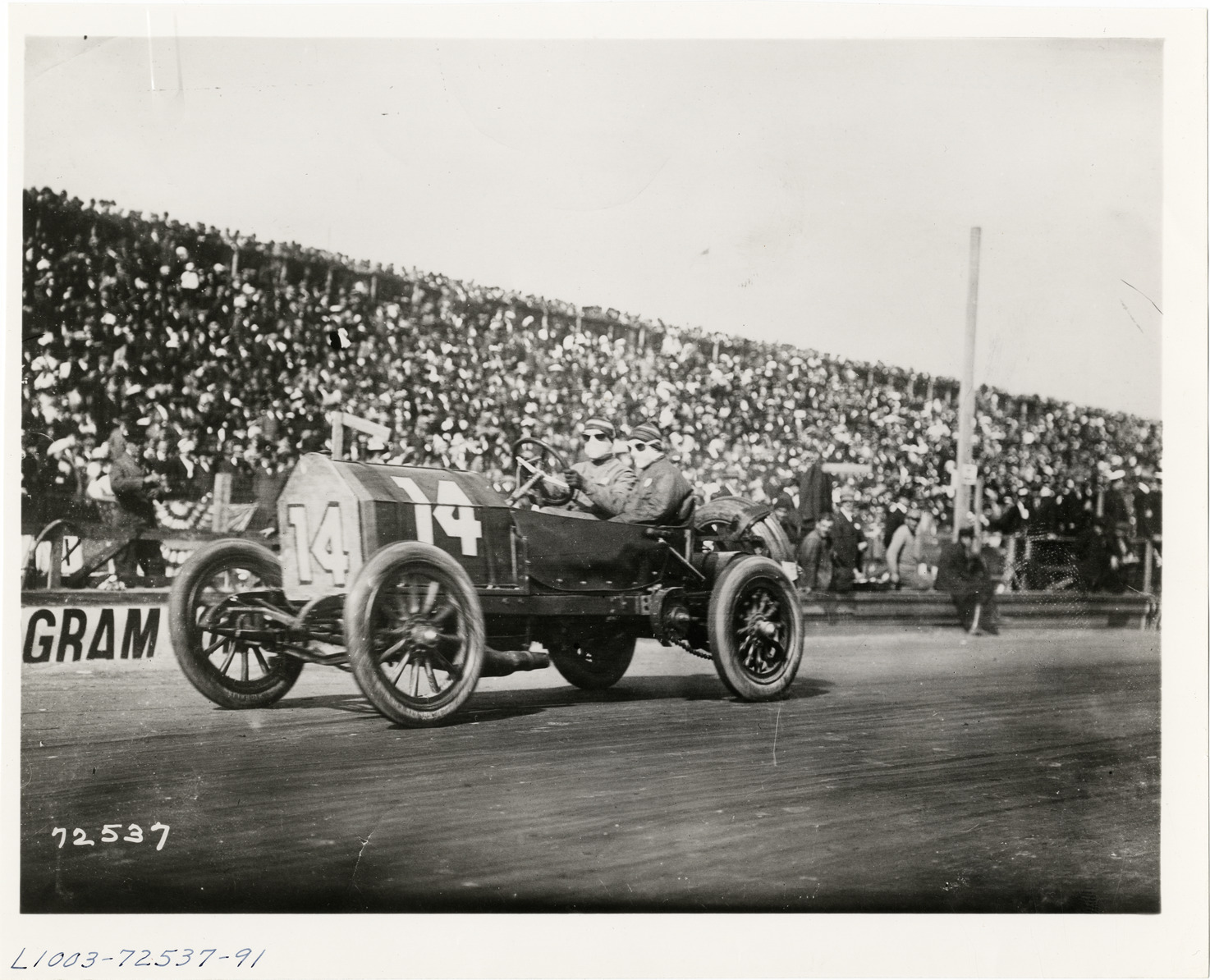 View of David Bruce-Brown and passenger racing Fiat car no. 14 during the 1911 Vanderbilt Cup races in Savannah, Georgia. Spectators in background. Handwritten on back: "David Bruce Brown in Fiat. Races and racing--Vanderbilt Cup races, 1911."