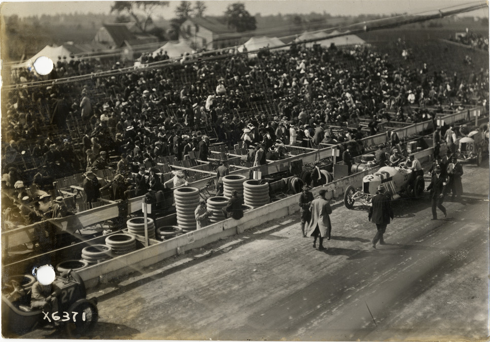 View of spectators in grandstand during the 1912 Vanderbilt Cup races in Milwaukee, Wisconsin. Tires stacked in pits in foreground; car no. 22 and car no. 26 are parked next to pits. Stamped on back: "Spooner & Wells, Inc., photographers, 1231 Woodward Ave., Detroit, Mich., telephone North 1745." Handwritten on back: "General view grandstand, Vanderbilt Race, October, 1912. Races and racing--Vanderbilt Cup races, 1912."