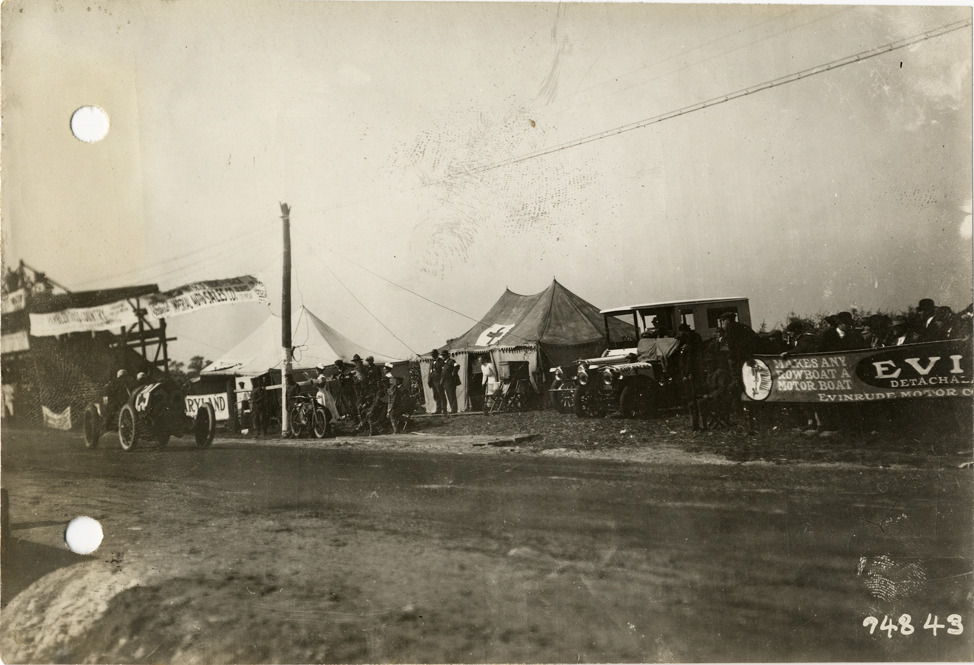 View of Teddy Tetzlaff and passenger racing Fiat car no. 29 past grandstand during the 1912 Vanderbilt Cup races in Milwaukee, Wisconsin. First aid tent, cars and spectators on roadside. Handwritten on back: "Tetzlaff in the #29 Fiat passing the grand stand, Vanderbilt Race, 1912. Races and racing--Vanderbilt Cup races, 1912."