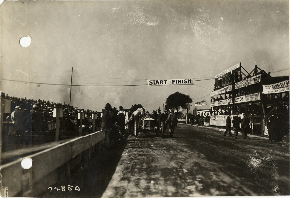View of driver Ralph Mulford and pit crew working on Knox car no. 24 under "Start-Finish" banner during the 1912 Vanderbilt Cup races in Milwaukee, Wisconsin. Handwritten on back: "Mulford in the #24 Knox taking supplies at the pits, Vanderbilt Cup Race, 1912. Races and racing--Vanderbilt Cup races, 1912."