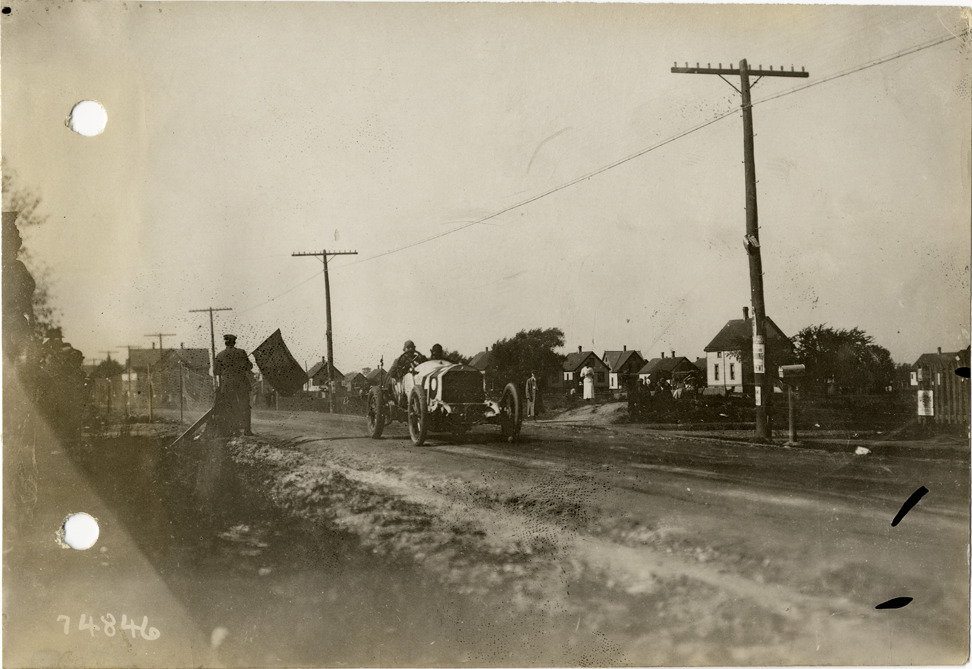 View of George Clark and passenger racing Mercedes car no. 28 past official holding flag during the 1912 Vanderbilt Cup races in Milwaukee, Wisconsin. Handwritten on back: "Clark in the #28 Mercer [sic] under action in the 1912 Vanderbilt Cup Race, 1912. Races and racing--Vanderbilt Cup races, 1912."