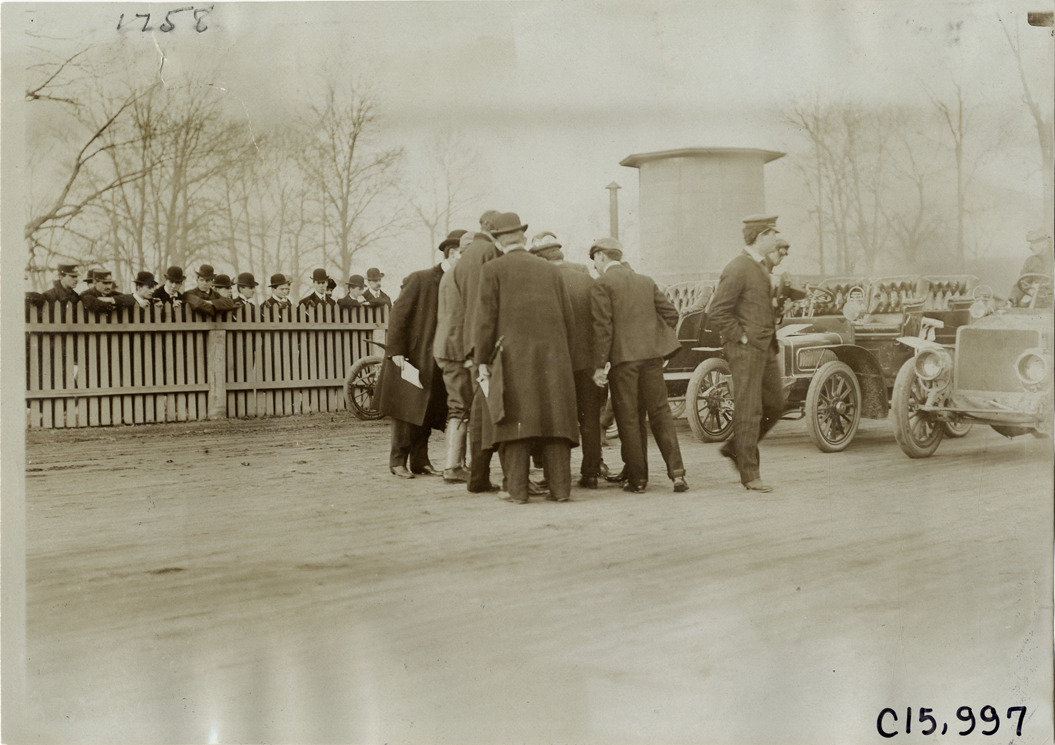 View of group of racing officials at starting line during the 1904 Waverly races at Weequahic Park in Waverly, New Jersey. Row of racecars on track; spectators behind fence in background. Handwritten on back: "Weequahic Park, Waverly, N.J. Races and racing--Waverly, 1904."