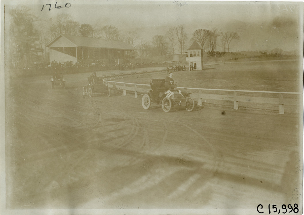 View of three cars racing on track during the 1904 Waverly races at Weequahic Park in Waverly, New Jersey. Grandstand and judges' stand in background. Handwritten on back: "Weequahic Park, Waverly, N.J. Races and racing--Waverly, 1904."