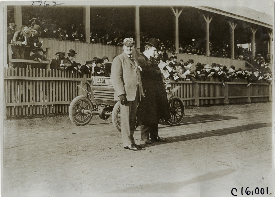 View of two racing officials standing in center of track during the 1904 Waverly races at Weequahic Park in Waverly, New Jersey. Grandstand, spectators and racecar in background. Handwritten on back: "Weequahic Park, Waverly, N.J. Races and racing--Waverly, 1904."