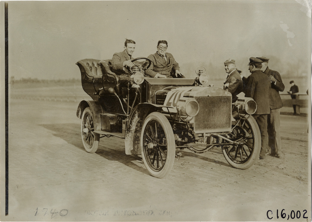 View of driver and passenger posing in car no. 20 during the 1904 Waverly races at Weequahic Park in Waverly, New Jersey. Racing officials stand next to car. Handwritten on back: "Weequahic Park, Waverly, N.J. Races and racing--Waverly, 1904."