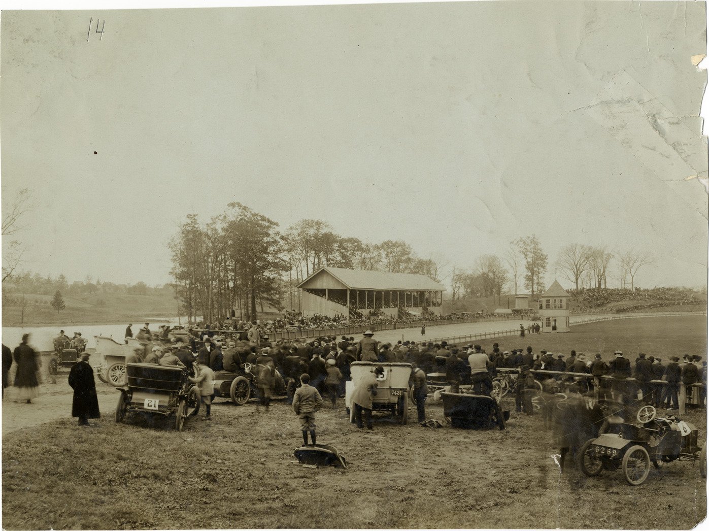 Rear view of spectators and cars on side of track during the 1906 Waverly races at Weequahic Park in Waverly, New Jersey. Grandstand and officials' stand in background. Stamped on back: "Photo by F. Ed. Spooner, 1536 B'way, telephone 6536-38th St., New York, N.Y." Handwritten on back: "Weequahic Park, Waverly, N.J. Races and racing--Waverly races, 1906."