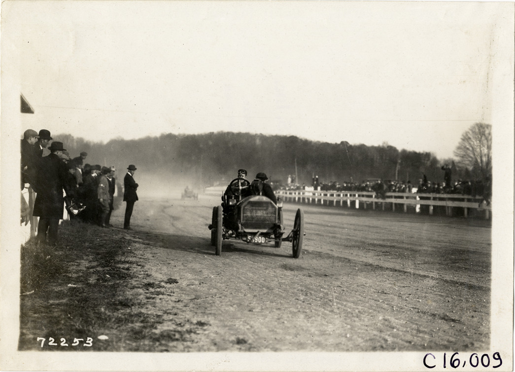 View of driver and passenger racing car past spectators during the 1911 races at the fairgrounds in White Plains, New York. Stamped on back: "Spooner & Wells, Inc., photographers, telephones 3472-3473 Columbus, 1931 Broadway, New York." Handwritten on back: "Races and racing--White Plains races, 1911."