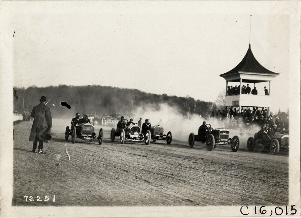 Racecars at starting line, 1911 White Plains races
