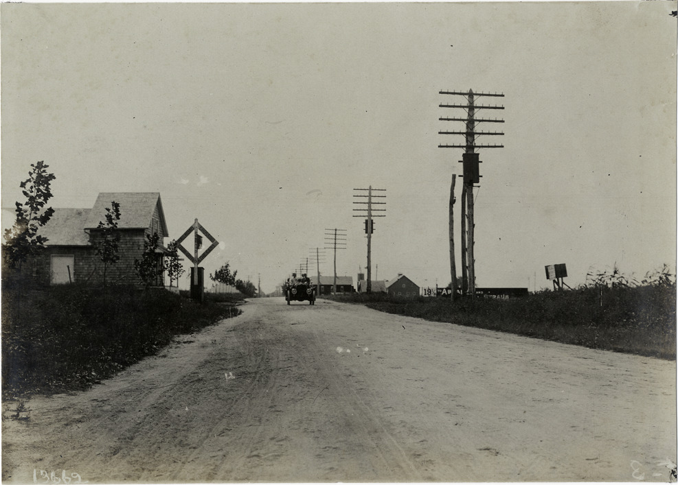 View of motorists in car at rural railroad crossing, part of the course for the 1906 Vanderbilt Cup races on Long Island, New York. Shingled building on left. Handwritten on back: "Race courses--Vanderbilt Cup, 1906."