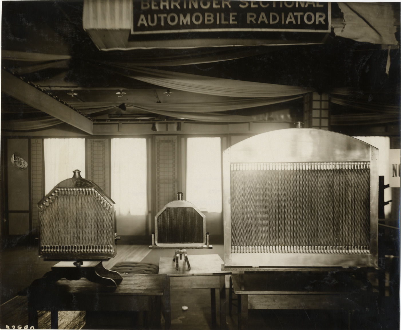 View of three car radiators in showroom, manufactured by Behringer Radiator Works. Sign in showroom reads: "Behringer sectional automobile radiator." Stamped on back: "Spooner & Wells, Inc., photographers, telephones 3472-3473 Columbus, 1931 Broadway, New York." Handwritten on back: "Behringer, 1910."