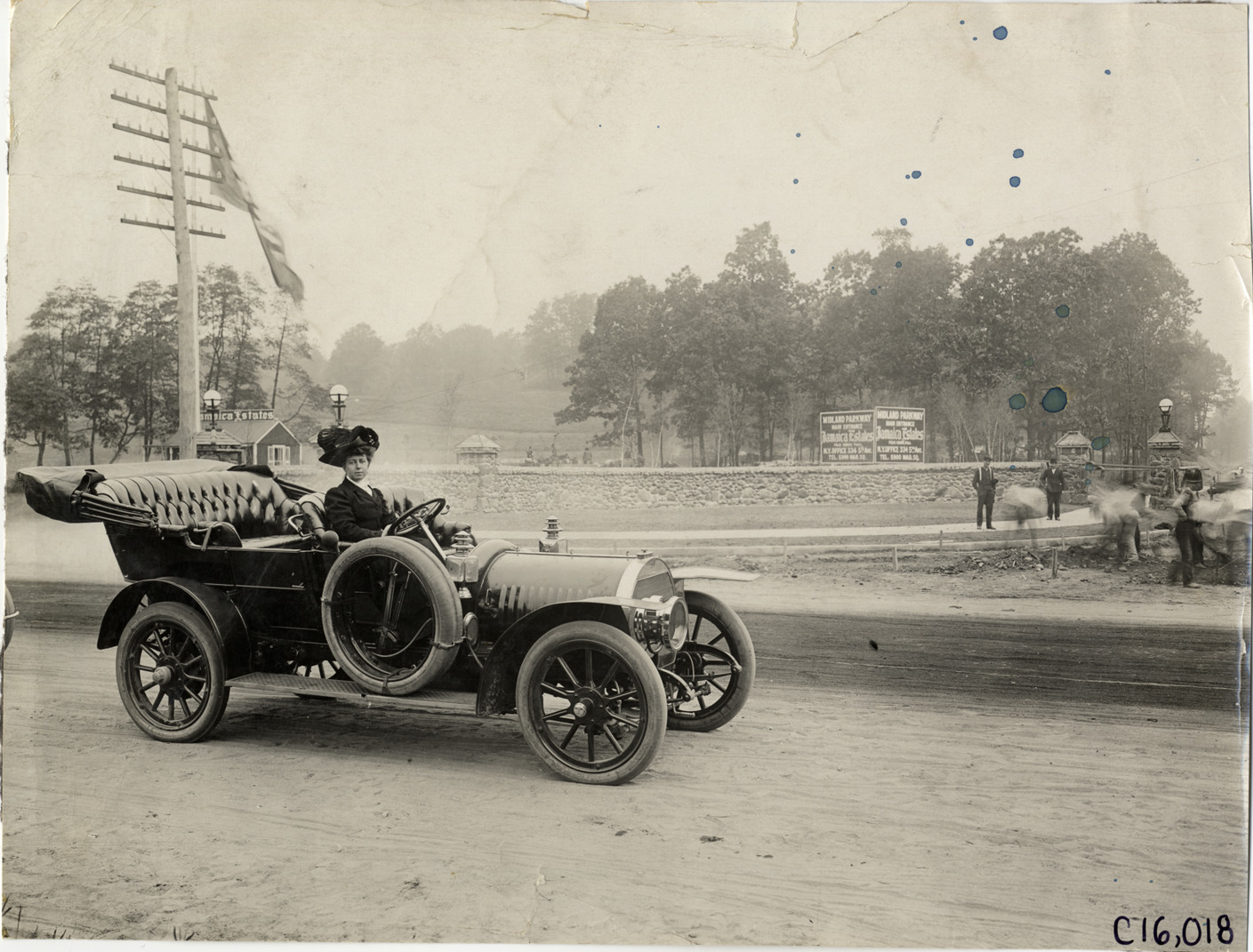 Favorite this☆ Joan Cuneo in 1908 Rainier automobile Description: View of Joan Cuneo posing in 1908 Rainier car. Stone wall and sign for entrance to Jamaica Estates in background. Signs read: "Midland Parkway, main entrance, Jamaica Estates." Handwritten on back: "Joan Cuneo. Rainier, 1908." Details Resource ID: na016968 Subject: Cuneo, Joan Newton, 1876-1934 Automobiles Rainier Motor Car Company Women automobile drivers Photographic prints Date Issued: Unknown year Format: 1 photographic print ; 7.25 x 9.5 in. Member of: National Automotive History Collection Lazarnick Collection Filing Location: Rainier Negative Number: Negative #C16,018 Rights: Physical rights are retained by DPL. Copyright is retained in accordance with U.S. copyright laws.