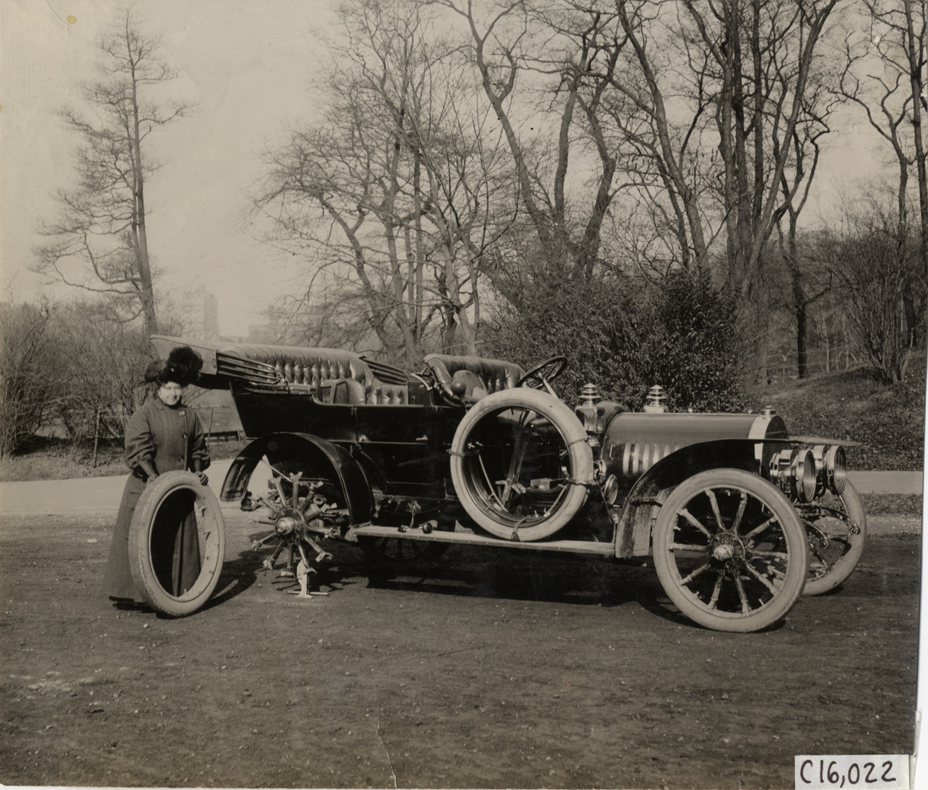 Favorite this☆ Joan Cuneo changing tire on 1908 Rainier automobile Description: View of Joan Cuneo changing tire on 1908 Rainier car. Handwritten on back: "Joan Cuneo. Rainier, 1908." Details Resource ID: na016972 Subject: Cuneo, Joan Newton, 1876-1934 Automobiles Rainier Motor Car Company Automobiles--Tires--Maintenance and repair Women automobile drivers Photographic prints Date Issued: Unknown year Format: 1 photographic print ; 7.5 x 8.75 in. Member of: National Automotive History Collection Lazarnick Collection Filing Location: Rainier Negative Number: Negative #C16,022 Rights: Physical rights are retained by DPL. Copyright is retained in accordance with U.S. copyright laws.