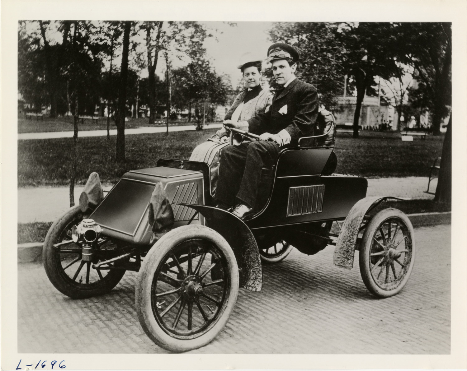 Dr. George B. Crissman and fiancee in 1902 Rambler Model C runabout