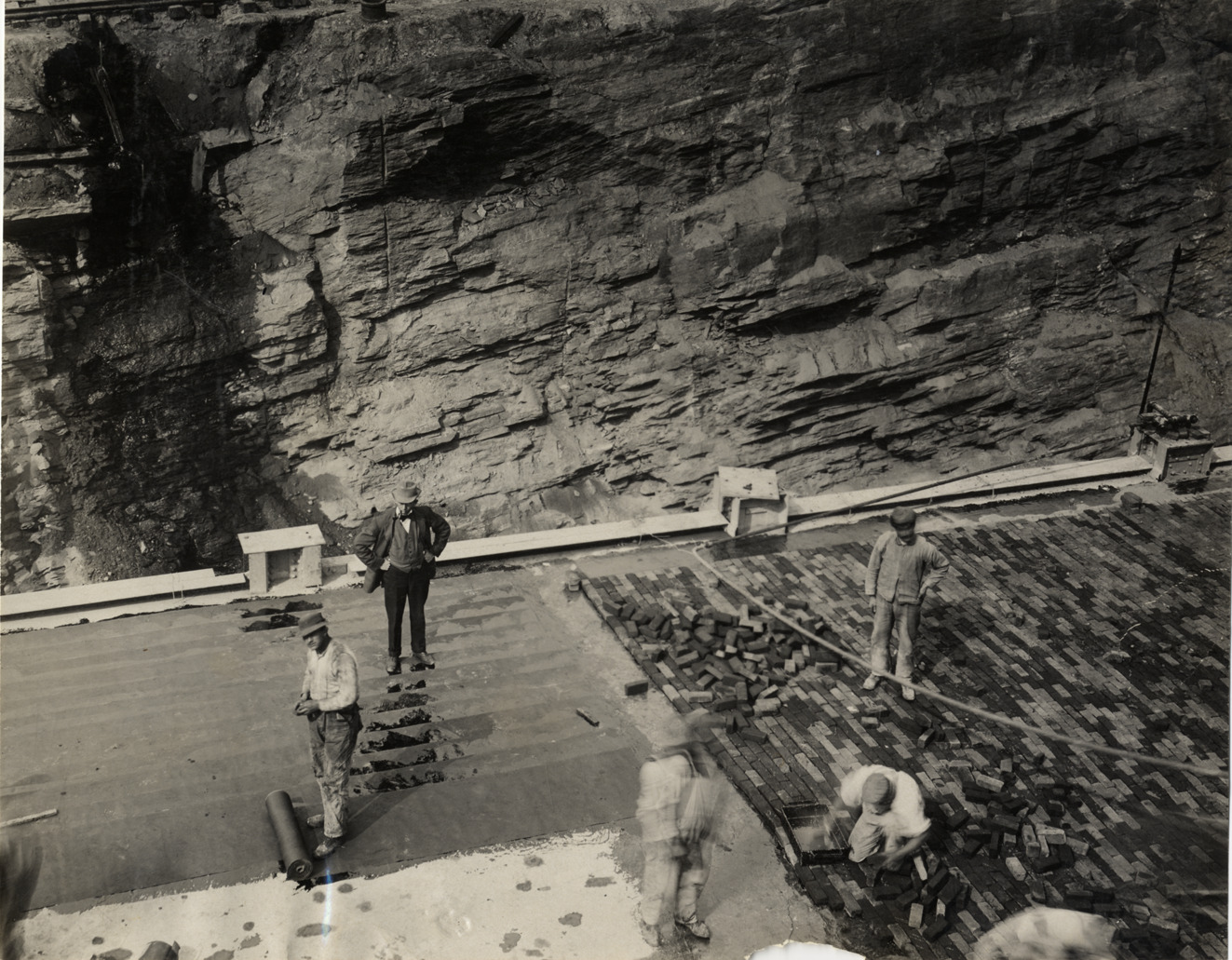 Bird's-eye view of men constructing brick road. Handwritten on back: "Road construction."