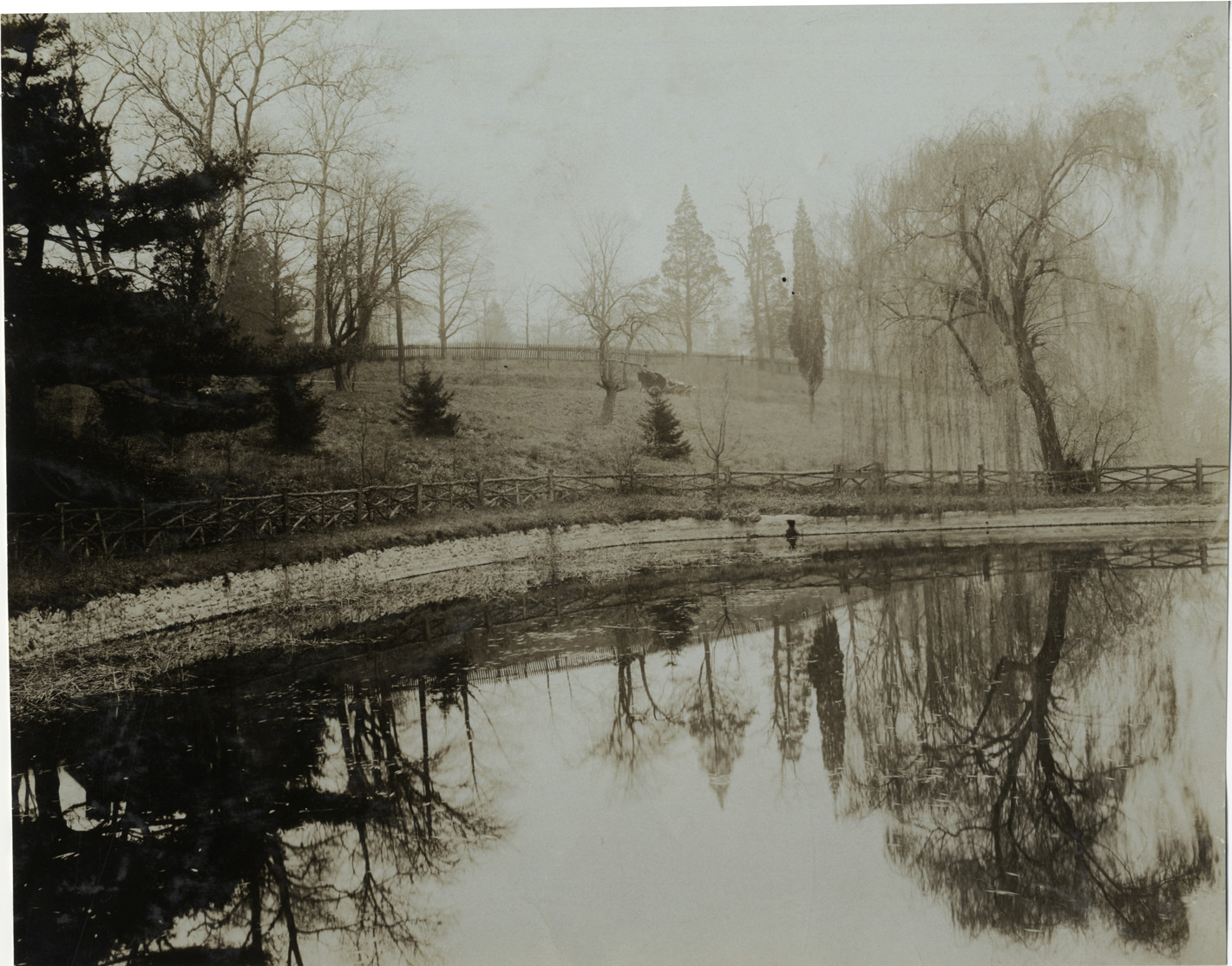 Favorite this☆ Automobile parked on road overlooking pond Description: Distant view of car parked on road overlooking pond. Rustic wooden fence in foreground; trees are reflected in pond. Handwritten on back: "Roads, 1906." Details Resource ID: na017082 Subject: Automobiles Ponds Wooden fences Photographic prints Date Issued: 1906 Format: 1 photographic print ; 7.5 x 9.5 in. Member of: National Automotive History Collection Lazarnick Collection Filing Location: Roads #2 Rights: Physical rights are retained by DPL. Copyright is retained in accordance with U.S. copyright laws.