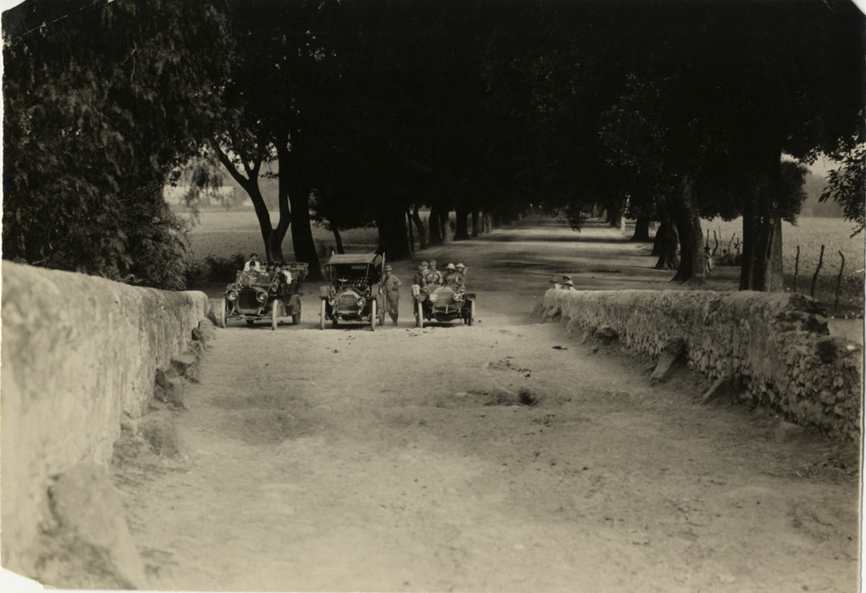 View of motorists posing with three cars lined up in tree-lined road. Stone wall, perhaps, a bridge approach, in foreground. Stamped on back: "Spooner & Wells, Inc., photographers, telephones 3472-3473 Columbus, 1931 Broadway, New York." Handwritten on back: "Roads, 1906."