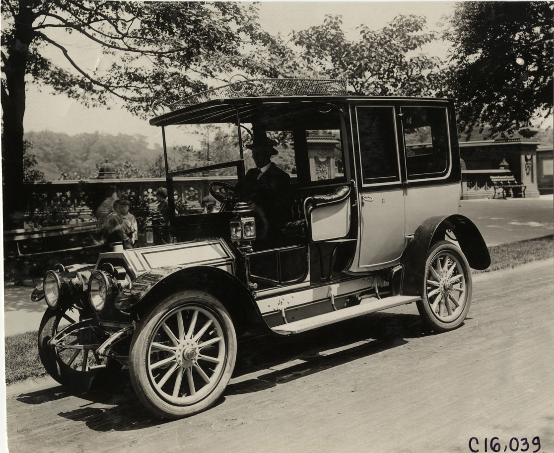 View of driver in 1909 Rochet-Schneider car. Park in background. Handwritten on back: "Rochet-Schneider, 1909."