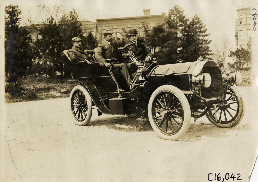 Favorite this☆ Motorists in 1904 Royal Tourist automobile Description: View of three men in 1904 Royal Tourist car. Handwritten on back: "Royal Tourist, 1904." Details Resource ID: na017118 Subject: Automobiles Royal Motor Car Company Photographic prints Date Issued: Unknown year Format: 1 photographic print ; 5 x 7 in. Member of: National Automotive History Collection Lazarnick Collection Filing Location: Royal Tourist Negative Number: Negative #C16,042 Rights: Physical rights are retained by DPL. Copyright is retained in accordance with U.S. copyright laws.